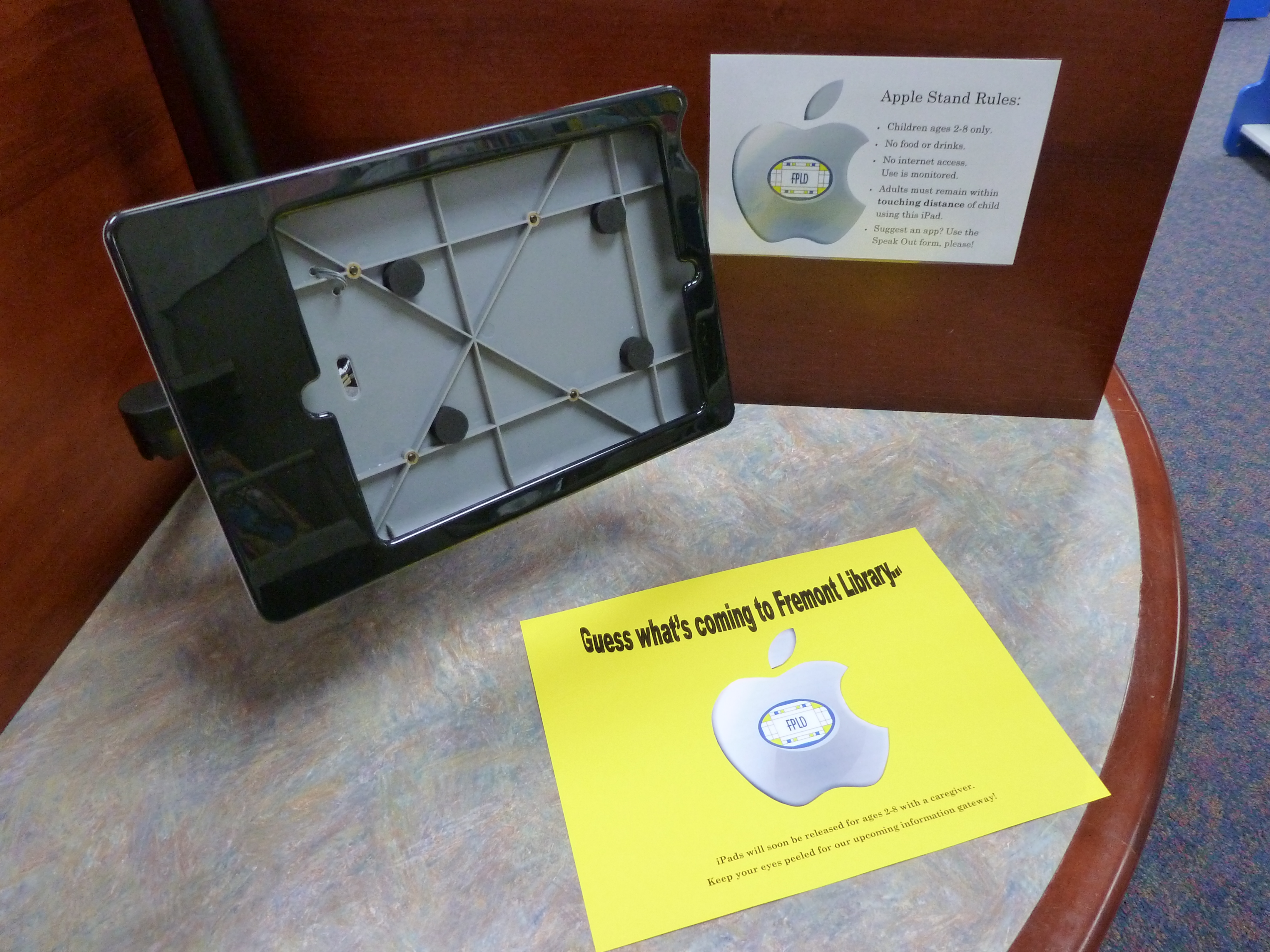 We approached publicity in a variety of ways. First, we set up Teaser signs at the Apple Stand to promote the up-and-coming devices. We then printed out or Apple Stand rules just to give people an idea about how to interact with the iPads (these would then stay up when the iPads were available). We sent a press release out to the newspapers (even garnering an interview with a local newspaper!), and we put an alert in our newsletter: