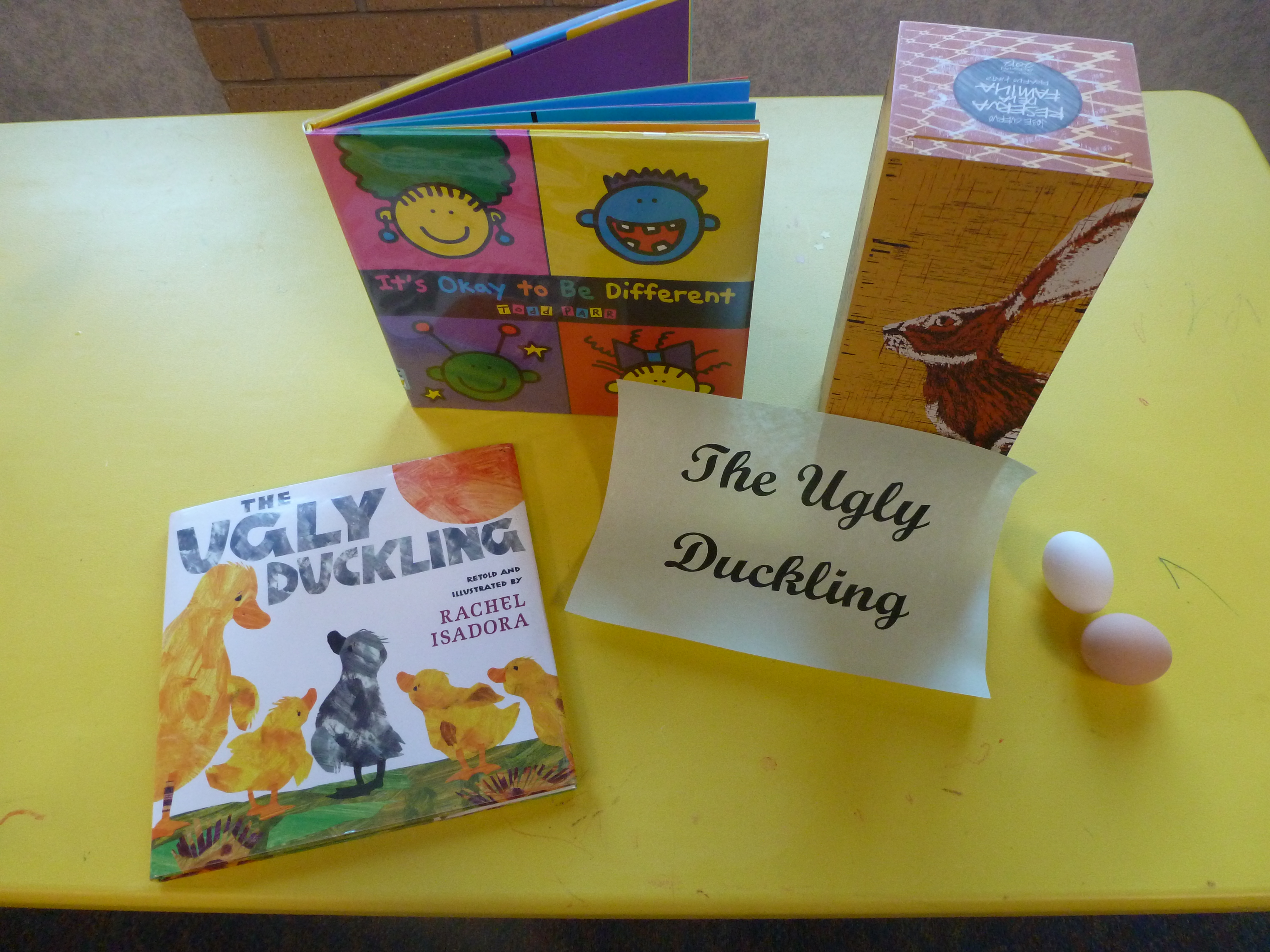 The tale of the Ugly Duckling is a classic tale of bullying based on appearance, of a poor duckling excluded from his family and laughed at by his neighbors. There is an infinite number of anti-bullying lesson plans and activities out there. Because I don’t have as much time with the children as a teacher might, I chose a select few–but very powerful. This storytime is an all ages, drop-in Saturday storytime and I had ages between 2 & 7. The ladies over at Jbrary reminded me that exclusion can be a hard topic to discuss with such a younger age set, but with the right tools, and the right tale, it can be done!