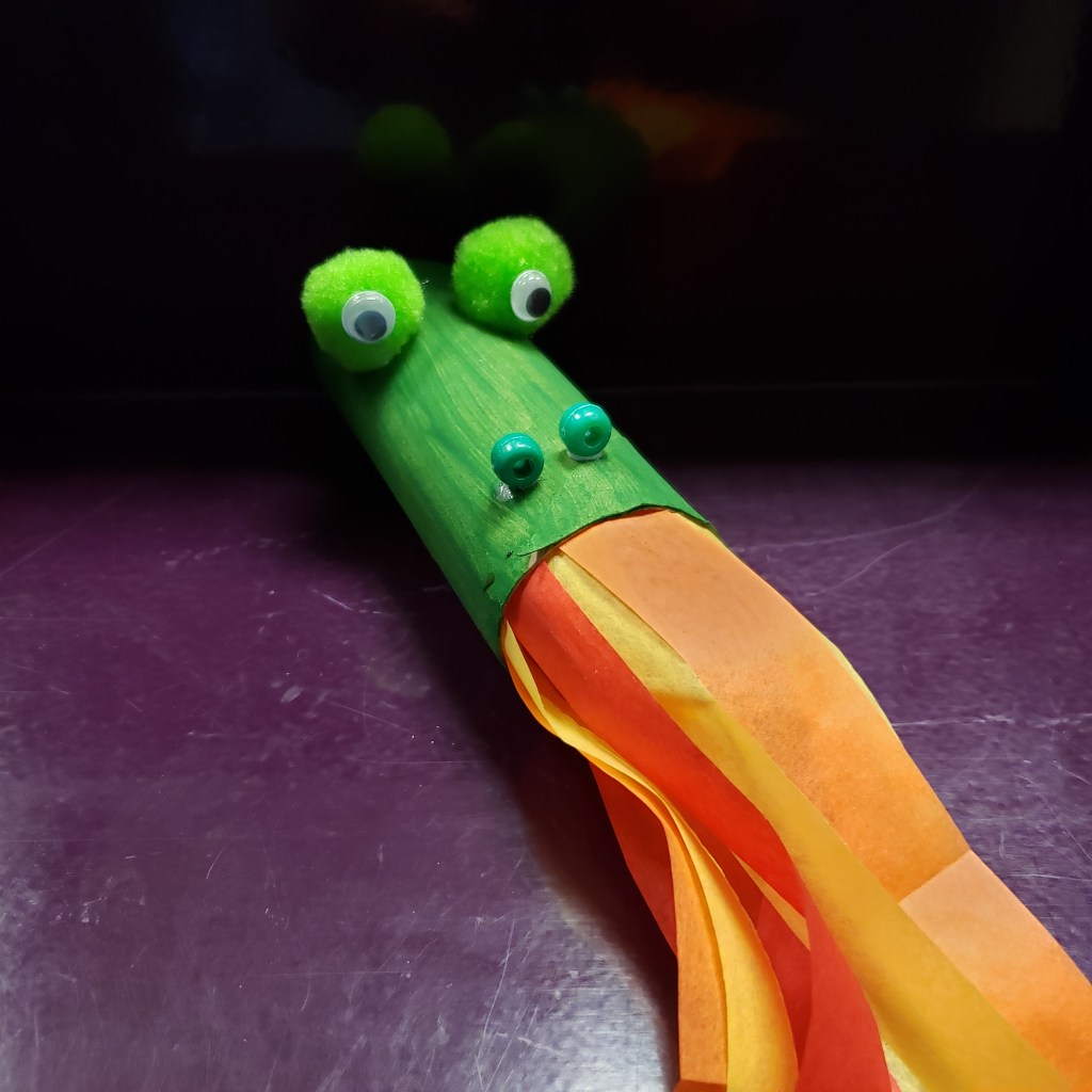 Craft kits available at library for registered patrons include: 2 pom poms, 2 googly eyes, 2 pony beads, 3 quarter sheets of tissue paper (red, yellow, and orange), 1 green toilet paper tube (pre-painted)